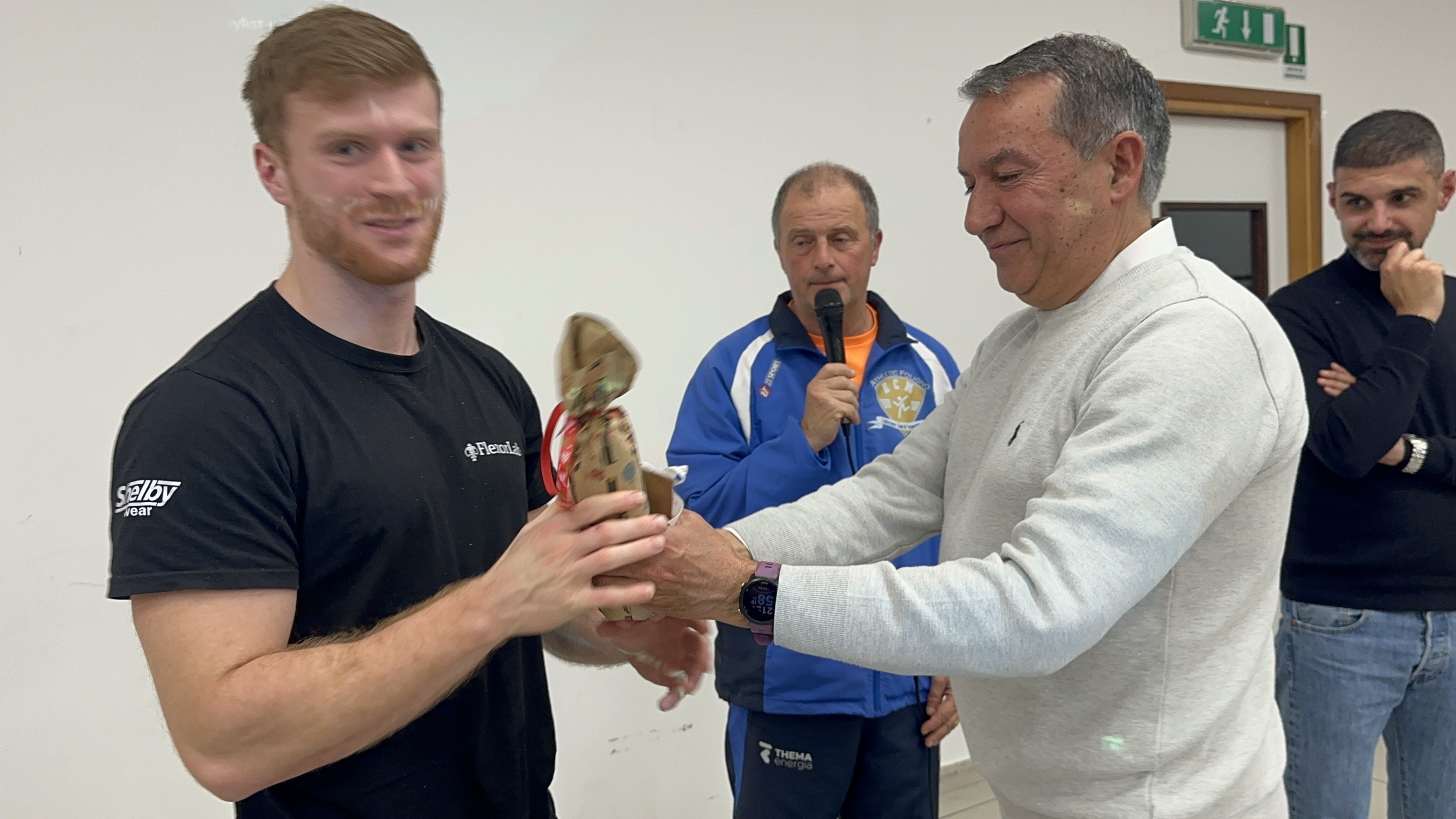 Alberto Stefanecchia, Presidente della Consulta dello Sport di Foligno, formalizza la consegna dei Gigli d'Oro assegnati durante la cerimonia ufficiale del Giglio d'Oro allo Sport 2025 a novembre, dove gli atleti ECM sono stati chiamati sul palco dell'Auditorium di San Domenico per ricevere l'importante onorificenza.